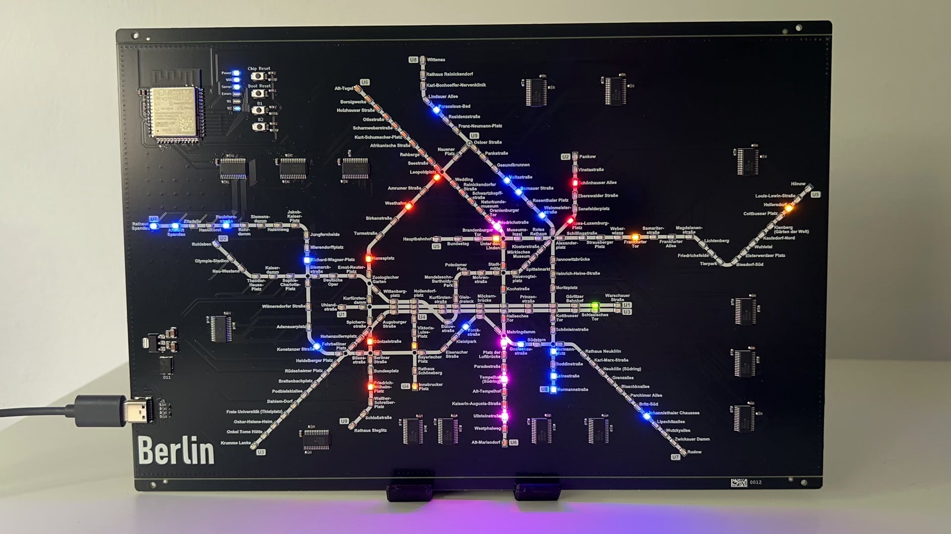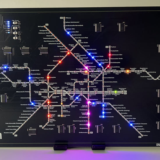 Diese einzigartige Berliner U-Bahn PCB vereint Technik und urbanes Design zu einem faszinierenden Deko Objekt. Die hochwertige Leiterplatte zeigt das komplette Liniennetz der Berliner U-Bahn mit 214 individuell ansteuerbaren LEDs, die in Echtzeit die aktuellen U-Bahn-Bewegungen (laut Fahrplan) visualisieren. Ein perfektes Geschenk für Berlin-Liebhaber, Technik-Enthusiasten und alle, die das Besondere schätzen.