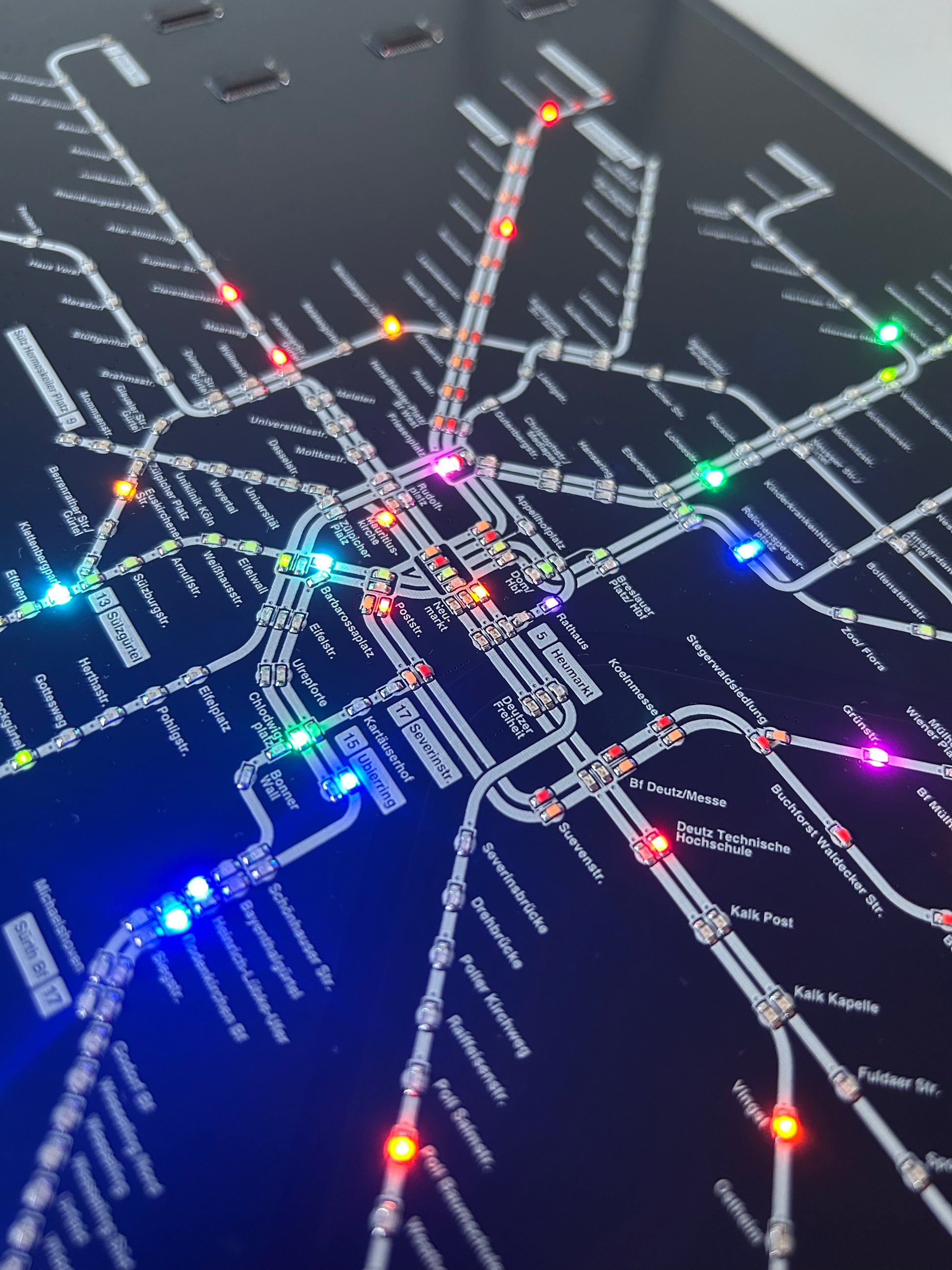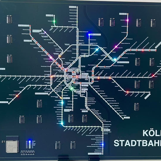 Diese einzigartige Kölner Stadtbahn PCB vereint Technik und urbanes Design zu einem faszinierenden Deko Objekt. Die hochwertige Leiterplatte zeigt das komplette Liniennetz der Kölner Stadtbahn mit 361 individuell ansteuerbaren LEDs, die in Echtzeit die aktuellen Stadtbahn-Bewegungen visualisieren. Ein perfektes Geschenk für Köln-Liebhaber, Technik-Enthusiasten und alle, die das Besondere schätzen.